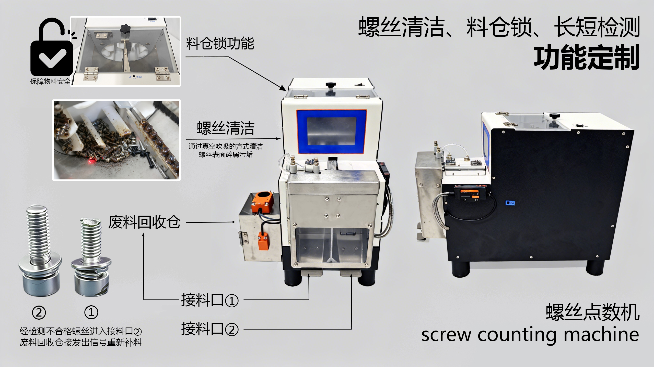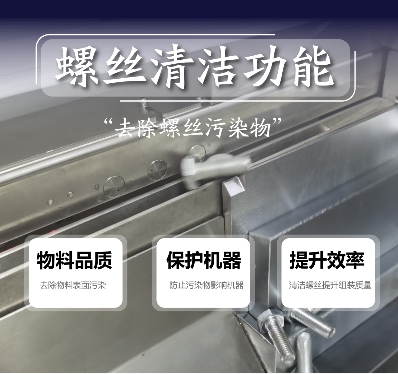 每一顆被選中的螺絲,在進入(rù)軌(guǐ)道後,都會經曆一場徹底的“沐浴”——高壓(yā)氣吹拂結合瞬間真空吸(xī)附,灰(huī)塵、碎屑、微小的油汙雜質被(bèi)高效剝離並收集(jí)至廢料盒,隻留(liú)下潔淨的(de)螺(luó)絲走向裝配位(wèi)。這確(què)保了每一次鎖付的純粹(cuì),從源頭守護產品品(pǐn)質與設備壽命。